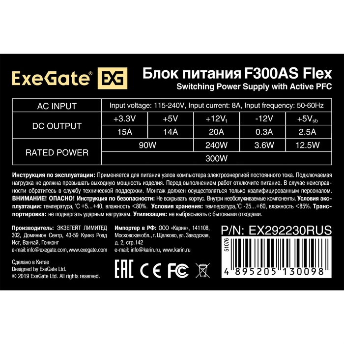 Блок питания ExeGate F300AS EX292230RUS 300W (Flex ATX, for ITX case, APFC, КПД 80% (80 PLUS), 4cm fan, 24pin, 4+4pin, 3xSATA, 2xIDE)