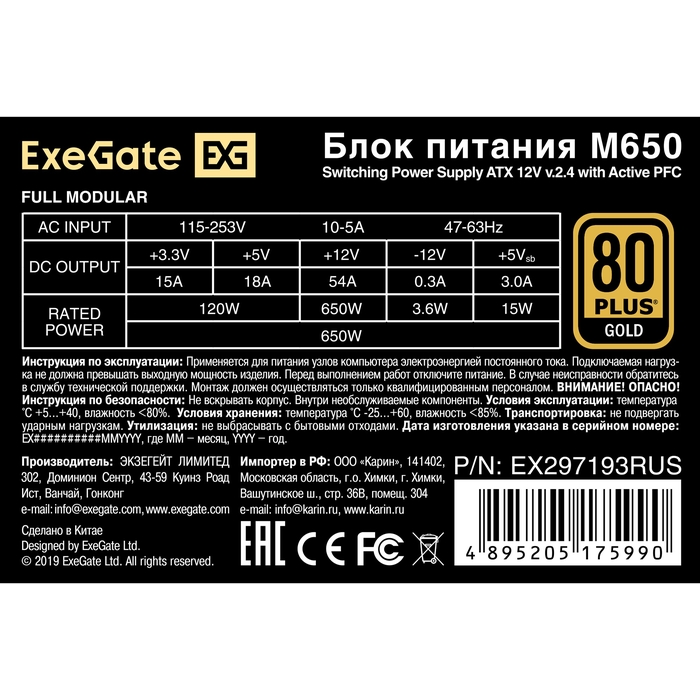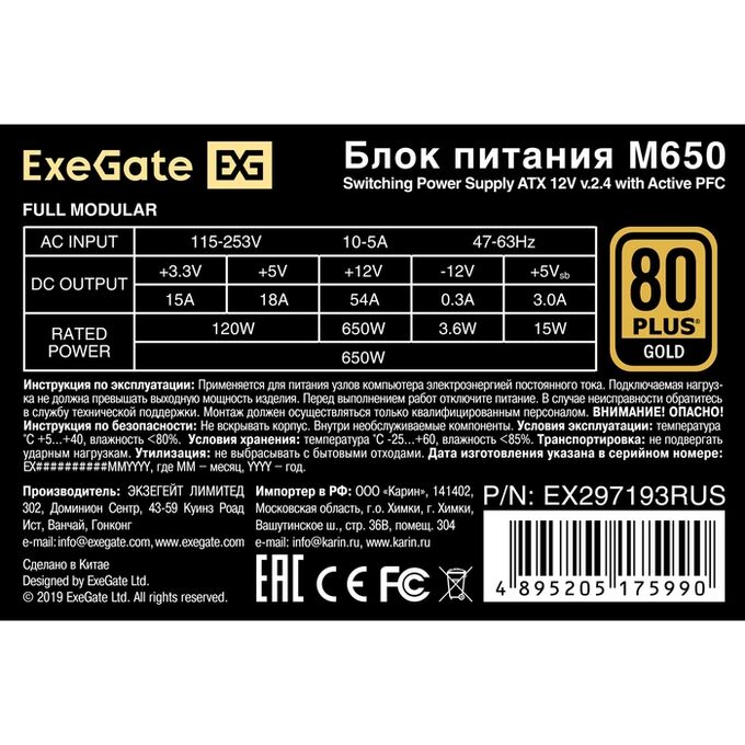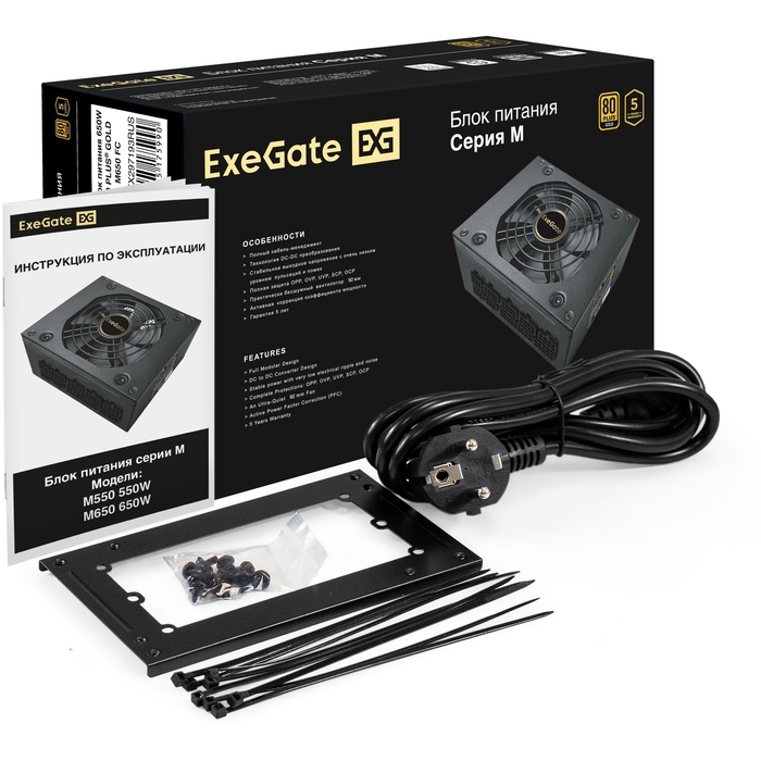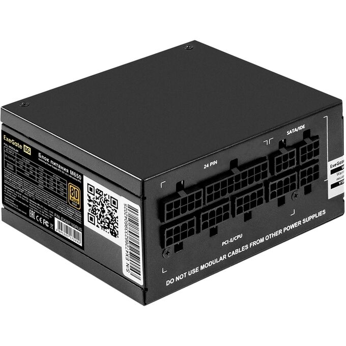 Блок питания Exegate M650 Gold EX297193RUS 650W (SFX, APFC, КПД 90проц. (80 Plus Gold), 9cm fan, 24pin, (4+4)pin, 2xPCI-E, 6xSATA, 3xIDE, 1xFDD)