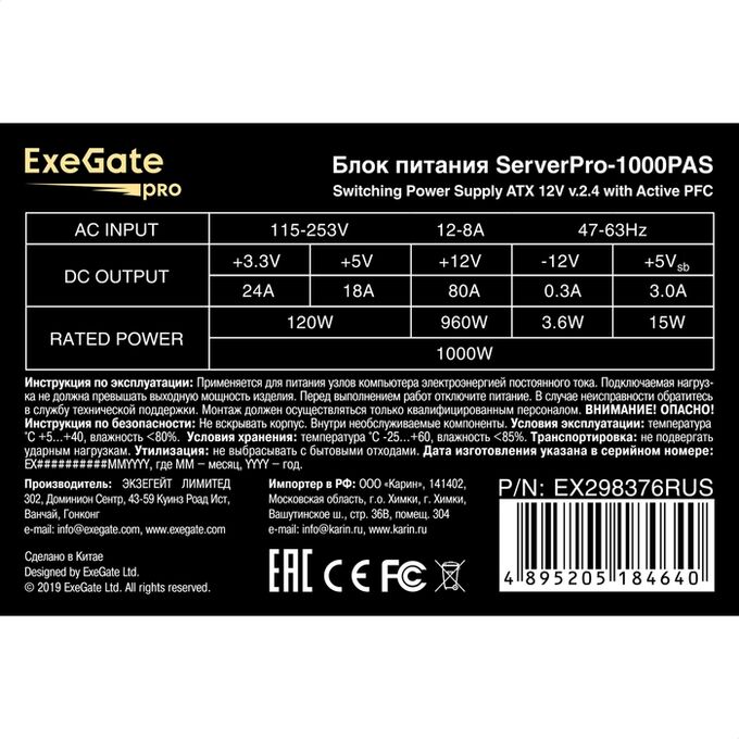 Блок питания ExeGate ServerPRO-1000PAS EX298376RUS 1000W (ATX, APFC, КПД 82 проц. (80 Plus), 12cm fan, 24pin, 2x(4+4)pin, 6xPCI-E, 8xSATA)