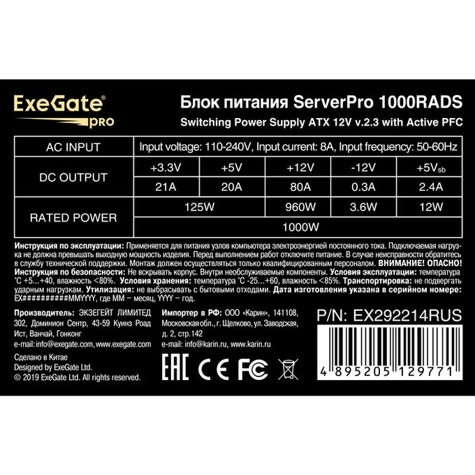 Блок питания ExeGate ServerPRO-1000RADS EX292214RUS 1000W (ATX, for 3U+ cases, APFC, КПД 82 (80 Plus), 14cm fan, 24pin, 2(4+4)pin, PCIe, 5xSATA