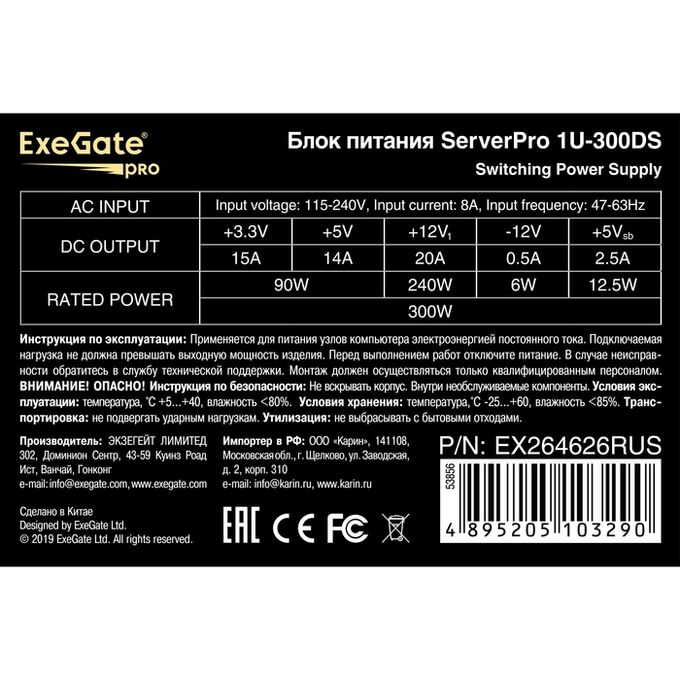 Блок питания Exegate ServerPro-1U-300DS EX264626RUS 300W, унив. для 1U, 24pin, (4+4)pin,4xSATA,2xIDE