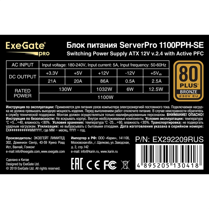 Блок питания ExeGate ServerPRO 80 PLUS® Bronze 1100PPH-SE EX292209RUS 1100W (ATX, for 3U+ cases, APFC, КПД 89% (80 PLUS Bronze), 12cm fan