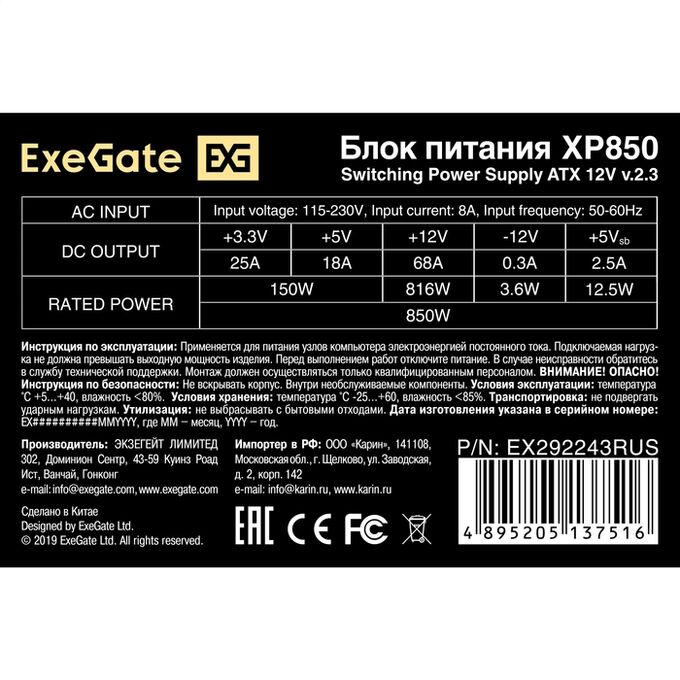 Блок питания ExeGate XP850 EX292243RUS 850W (ATX, 12cm fan, 24pin, 2x(4+4)pin, 2xPCI-E, 5xSATA, 3xIDE, black)