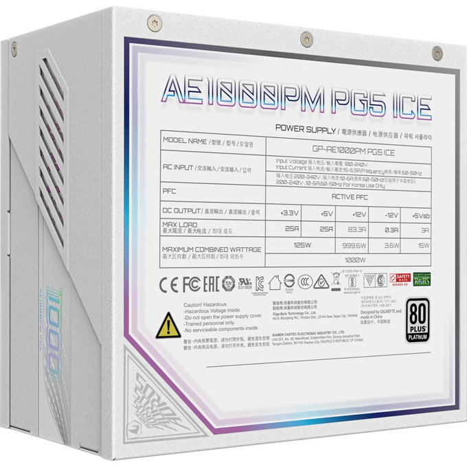 Блок питания Gigabyte AE1000PM PG5 Ice 1000W (GP-AE1000PM PG5 ICE), 80Plus, Platinum, Полностью модульный, PCIe Gen 5.1, ATX 3.0 compatible