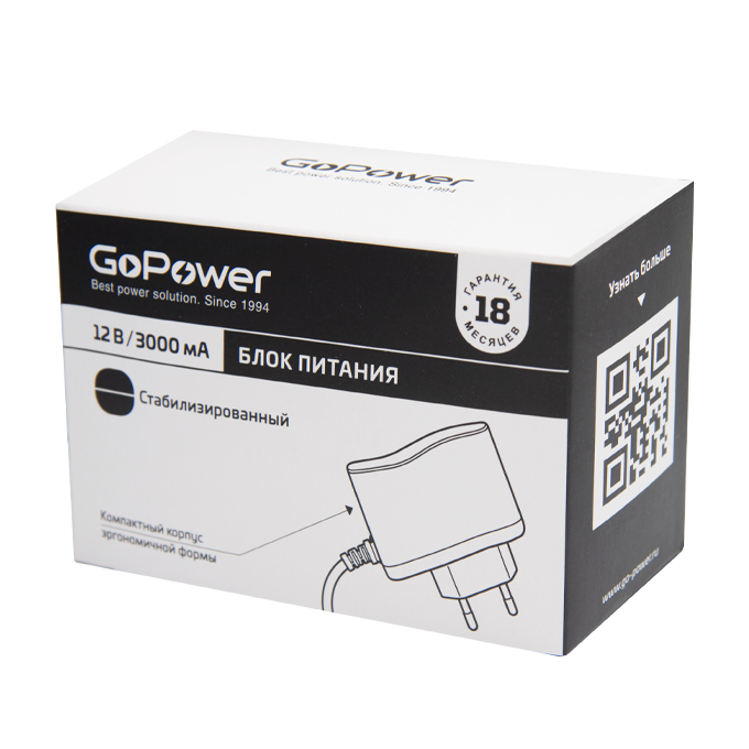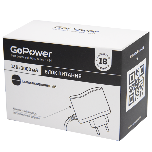 Блок питания GoPower 3.0A 12V 5,5x2,5/12мм импульсный (1/90)