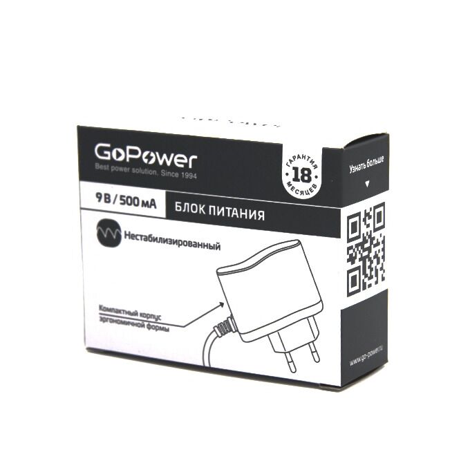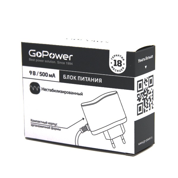 Блок питания GoPower 500mA 9V 5,5x2,1/12мм нестабилизированный отрицательная полярность (1/100)