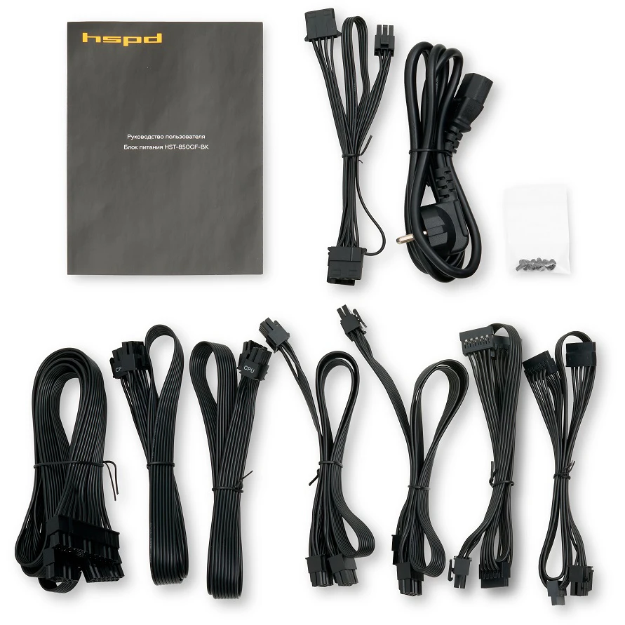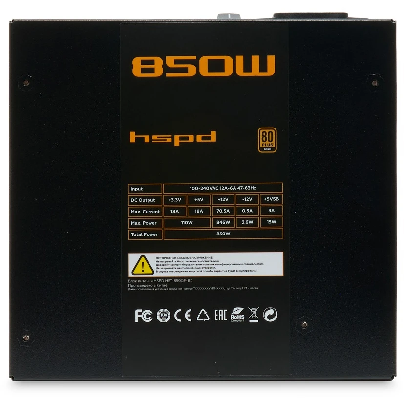 Блок питания HSPD HST-850GF-BK 850W 80+ Gold (ATX, 2.52, Full modular, 1x24(20+4)pin 600mm, 2xCPU 8(4+4)pin 700mm, 2xPCIe*2 8(6+2)pin