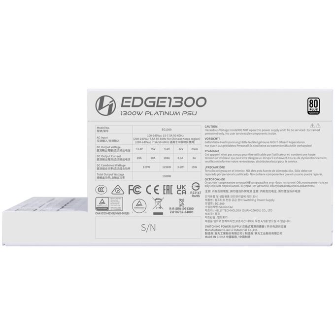 Блок питания Lian Li EG1300 (G9P.EG1300.WE00.RU) / White / ATX 3.1, 1300W, 80 Plus Platinum, PCIe 5.1, APFC, USB HUB, 120mm FDB Fan, Fully Modular