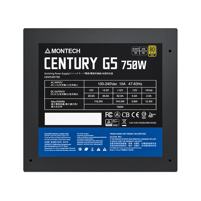 Блок питания Montech Century G5 750W / ATX 3.0, APFC, 80 Plus Gold, Full Bridge LLC, DC-DC, Japan caps, 120mm fan, full modular