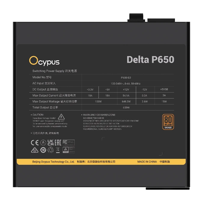 Блок питания Ocypus Delta P650 (Delta-P650-B1FDBK024X-EU) 650W (ATX, 80+ Bronze, APFC, 20+4 pin, 120mm fan, PCI-E 6+2Px3, 8xSATA)