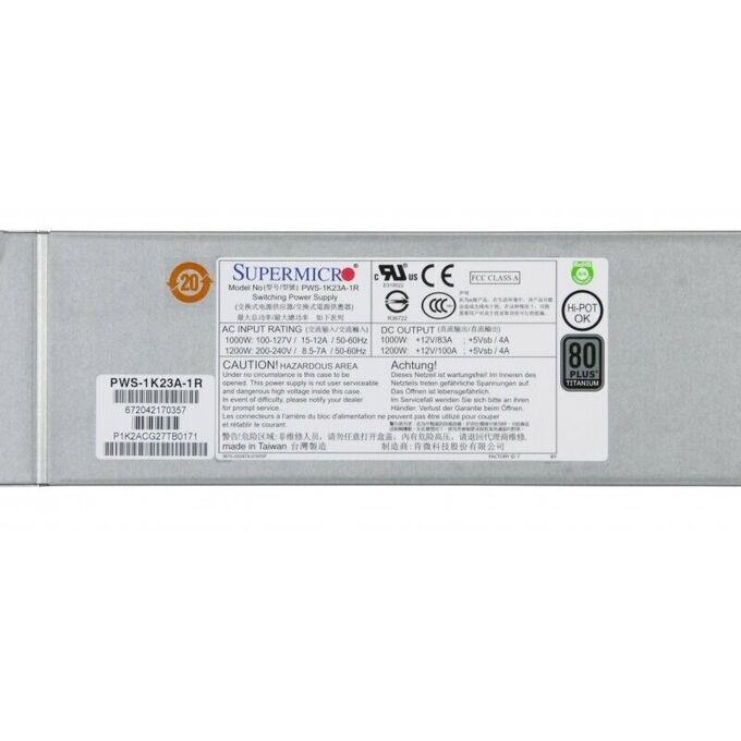 Блок питания SuperMicro PWS-1K23A-1R 1200W, Titanium Level, Redundancy, 1U