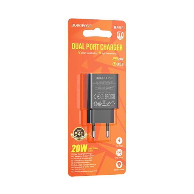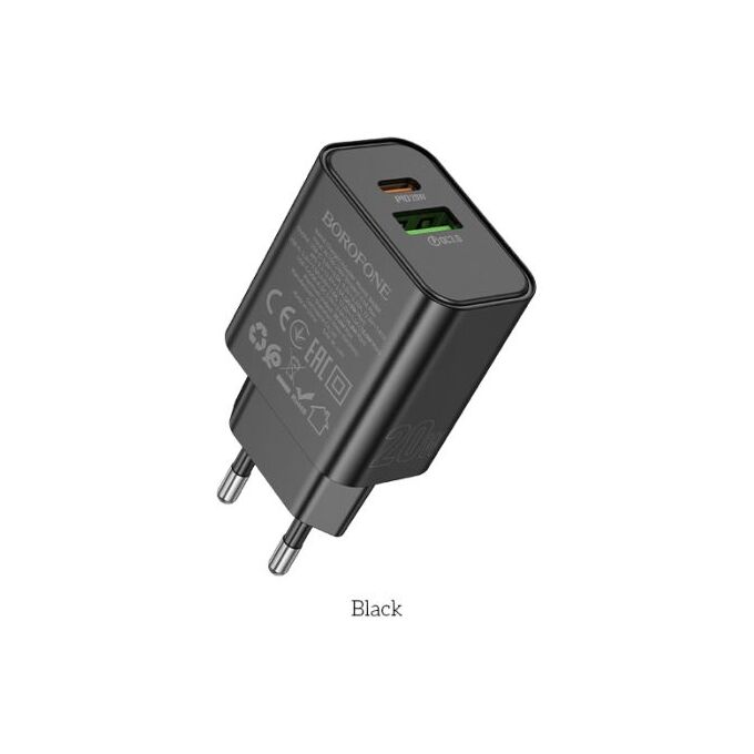 Сетевое зарядное устройство BOROFONE BA88A/ СЗУ/ PD + QC 3.0/ 2 USB: Type-C + Type-A/ Выход: 20W+18W/ Черный