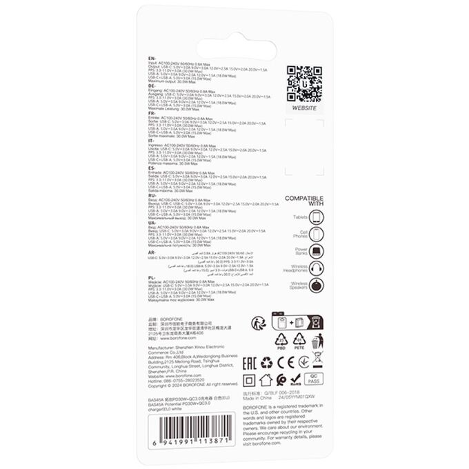 Сетевое зарядное устройство BOROFONE BAS45A/ СЗУ/ PD + QC 3.0/ 2 USB: Type-C + Type-A/ Выход: 30W + 18W/ Белый