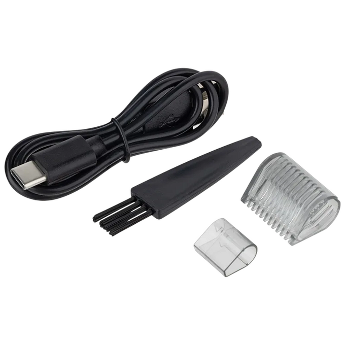 2Вт, работа от аккумулятора, лезвия из нерж.стали, 2 насадки, t работы 180мин, t зарядки 90мин, зарядка от USB (шнур в комплекте) , защитный колпачок, подсветка, щеточка