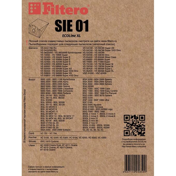 Бумажные пылесборники Filtero SIE 01 ECOLine XL 10+фильтр