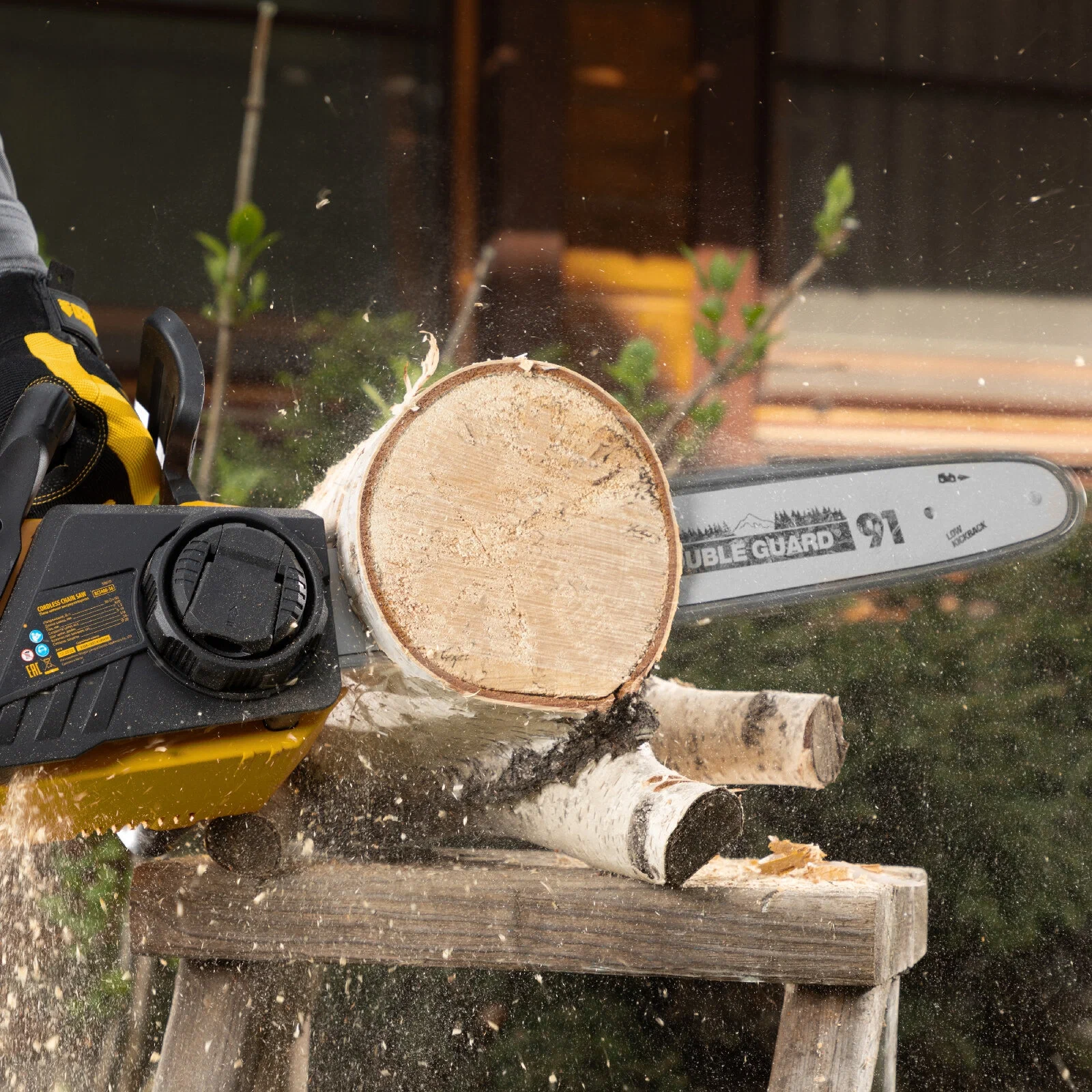 бесщёточный двигатель; одновременная работа от двух батарей 18 В; толщина ведущего звена цепи: 1.3 мм, количество звеньев: 56 шт.