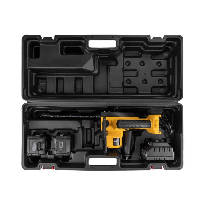 -Полная комплектация: рукоятка, шина, цепь, два аккумулятора, зарядное устройство, кейс и набор инструментов