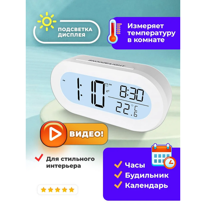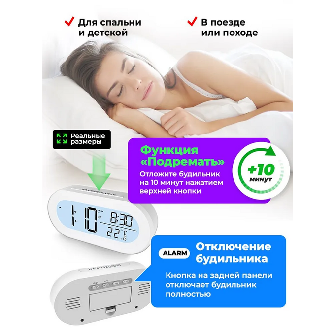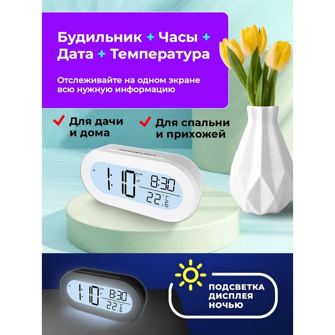 Элегантный дизайн данной модели подойдет для любых помещений и украсит любое пространство, как домашнее, так и рабочее. Подсветка дисплея, активируемая нажатием кнопки, позволит с легкостью использовать часы-будильник в темном помещении или в ночное время.