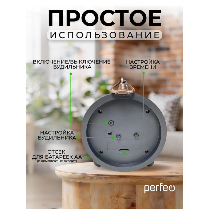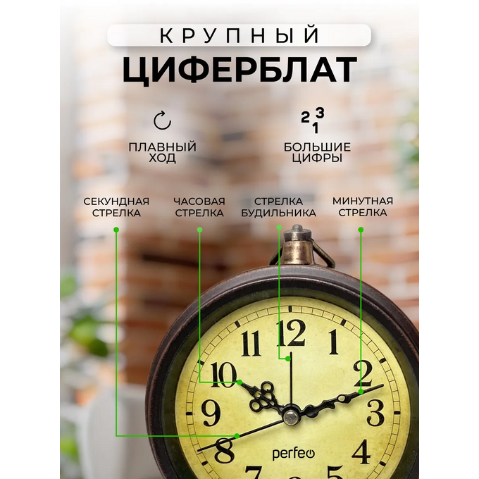 Часы-будильник Perfeo Quartz "PF-TC-033", винтажные, круглые, арабский циферблат, коричневый, (Арт. PF_C3159)