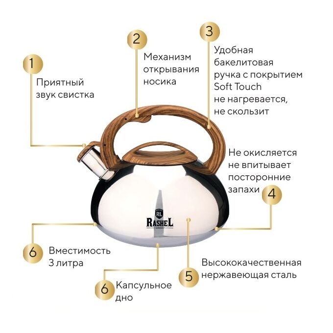 Чайник изготовлен из высококачественной нержавеющей стали. Нержавеющая сталь обладает высокой устойчивостью к коррозии, не окисляется и не впитывает посторонние запахи.