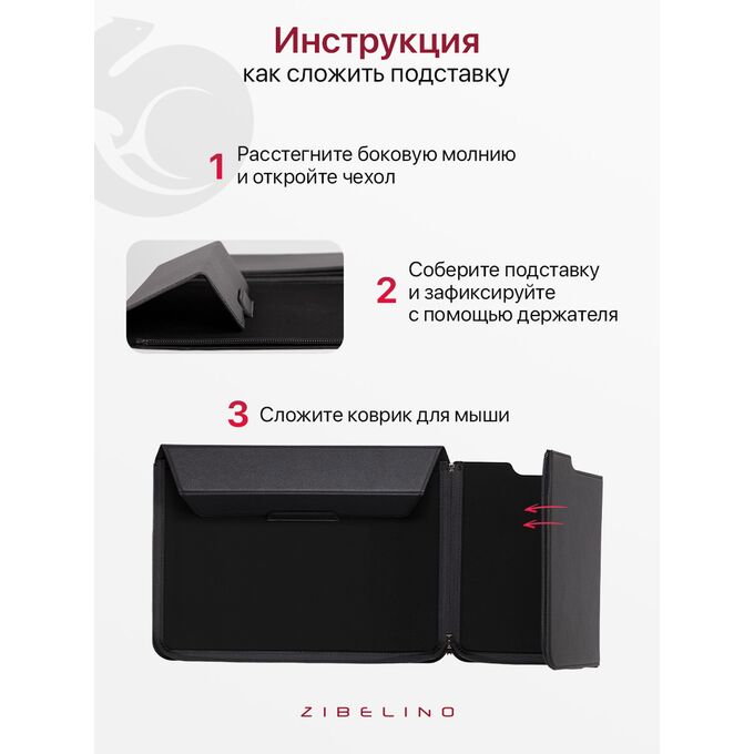 - Встроенный коврик для мыши. Для трансформации чехла расстегните молнию, откиньте направо переднюю сторону чехла и согните ее пополам по специальному сгибу.