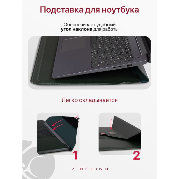 - Функция подставки для ноутбука. Для трансформации чехла прикрепите липучку на крышке к верхней застежке/ответной части на чехле. Теперь угол наклона ноутбука будет более подходящим для эргономичной работы: снижается нагрузка на запястья. Экран ноутбука располагается на уровне глаз, что существенно уменьшает напряжение в шее и спине.
