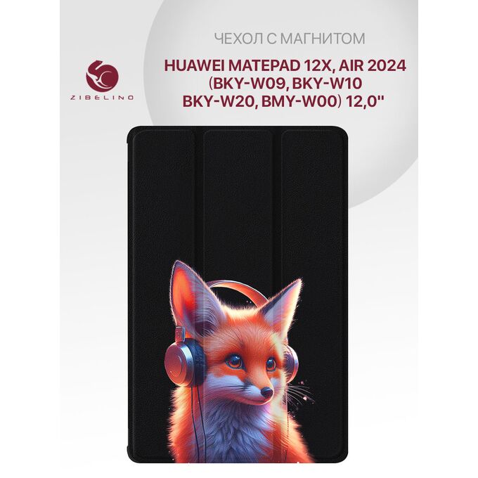 Чехол для планшета Huawei MatePad 12X, MatePad Air 2024 (12.0'') с рисунком, с магнитом, черный с принтом ЛИСЕНОК НАУШНИКИ (Хуавей МатеПад 12Х Хуавей МатеПад Аир 12 2024)
