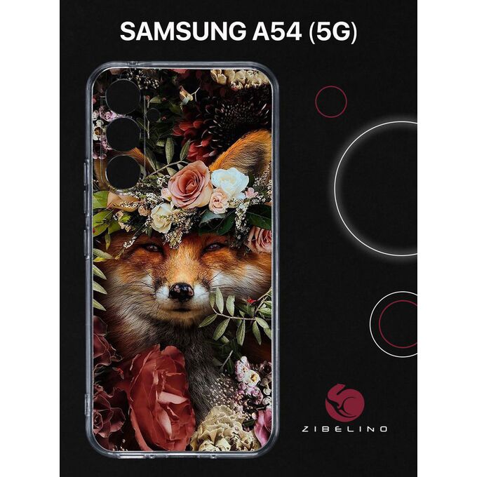 Чехол для Samsung Galaxy A54 прозрачный с рисунком, с защитой камеры, с принтом ЛИСА ЦВЕТЫ / Самсунг Галакси А54