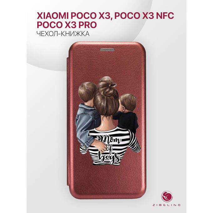Чехол книжка для Xiaomi Poco X3, X3 Pro с рисунком, с магнитом, бордовый, с принтом MOM OF BOYS
