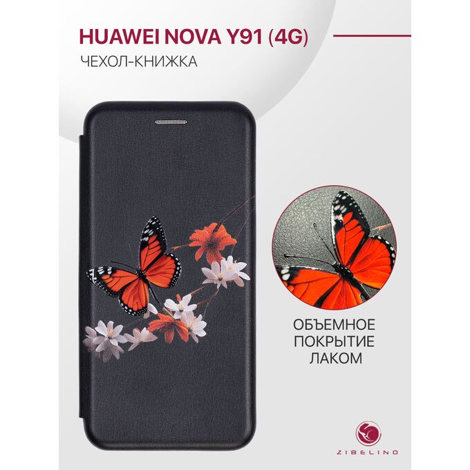 Чехол-книжка Book для Huawei Nova Y91 (4G) с рисунком, противоударный, с магнитом, черный с принтом БАБОЧКИ, с защитным лаковым покрытием (Хуавей Нова Y91)
