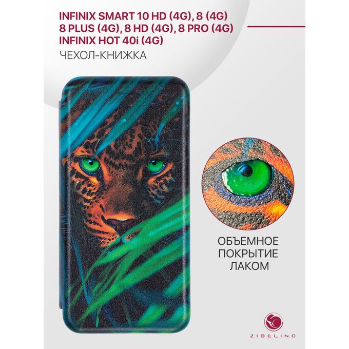 Чехол книжка Book для Infinix Smart 10 HD (4G), Smart 8 (4G), Smart 8 Plus (4G), Smart 8 HD (4G), Smart 8 Pro (4G), Hot 40i (4G) с рисунком, с магнитом, черный с принтом ЛЕОПАРД ЛЕС, с защитным лаковым покрытием (Инфиникс Смарт 10 8 Плюс Про HD Хот 40i)