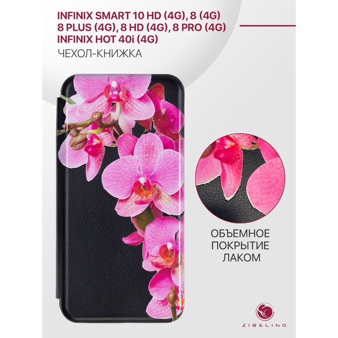 Чехол книжка Book для Infinix Smart 10 HD (4G), Smart 8 (4G), Smart 8 Plus (4G), Smart 8 HD (4G), Smart 8 Pro (4G), Hot 40i (4G) с рисунком, с магнитом, черный с принтом ОРХИДЕЯ ФУКСИЯ, с защитным лаковым покрытием (Инфиникс Смарт 10 8 Плюс Про HD Хот 40i