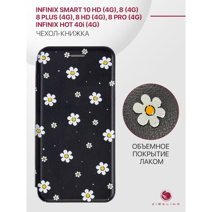 Чехол книжка Book для Infinix Smart 10 HD (4G), Smart 8 (4G), Smart 8 Plus (4G), Smart 8 HD (4G), Smart 8 Pro (4G), Hot 40i (4G) с рисунком, с магнитом, черный с принтом ПРОЗРАЧНЫЕ РОМАШКИ, с защитным лаковым покрытием (Инфиникс Смарт 10 8 Плюс Про HD Хот