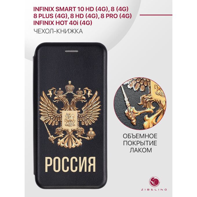 Чехол книжка Book для Infinix Smart 10 HD (4G), Smart 8 (4G), Smart 8 Plus (4G), Smart 8 HD (4G), Smart 8 Pro (4G), Hot 40i (4G) с рисунком, с магнитом, черный с принтом РОССИЯ ОРЁЛ, с защитным лаковым покрытием (Инфиникс Смарт 10 8 Плюс Про HD Хот 40i)