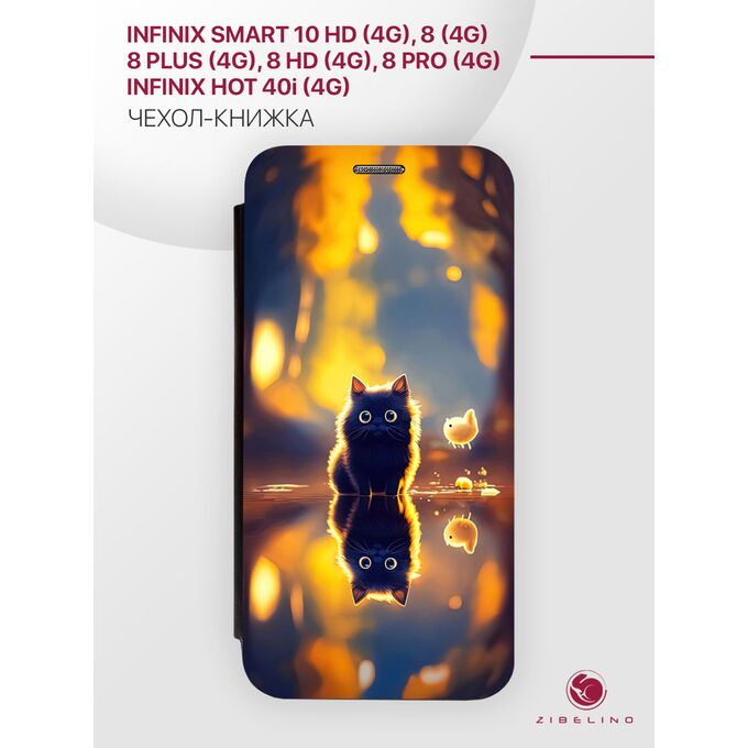 Чехол-книжка Book для Infinix Smart 10 HD (4G), Smart 8 (4G), Smart 8 Plus (4G), Smart 8 HD (4G), Smart 8 Pro (4G), Hot 40i (4G) с рисунком, с защитой камеры, противоударный, противоударный, черный с принтом КОТ ОТРАЖЕНИЕ (Инфиникс Смарт 10 8 Плюс Про HD