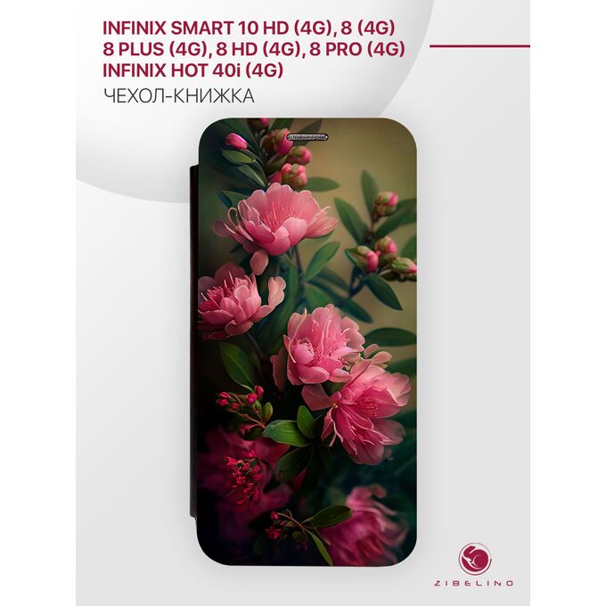 Чехол-книжка Book для Infinix Smart 10 HD (4G), Smart 8 (4G), Smart 8 Plus (4G), Smart 8 HD (4G), Smart 8 Pro (4G), Hot 40i (4G) с рисунком, с защитой камеры, противоударный, противоударный, черный с принтом РОЗОВЫЕ СОЦВЕТИЯ (Инфиникс Смарт 10 8 Плюс Про