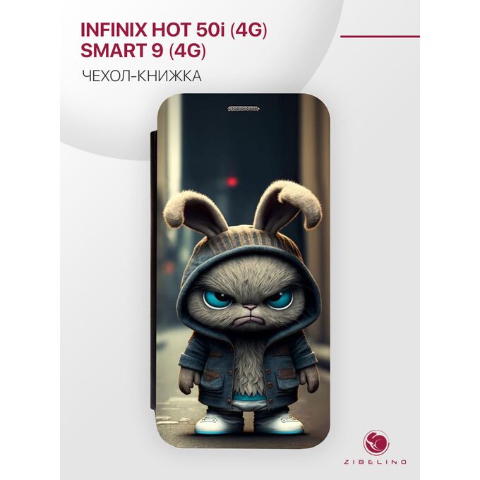 Чехол книжка Book для Infinix Hot 50i (4G), Smart 9 (4G) с рисунком, защитный, противоударный, с магнитом, черный с принтом ЗЛОЙ ЗАЯЦ (Инфиникс Хот 50i, Инфиникс Смарт 9)