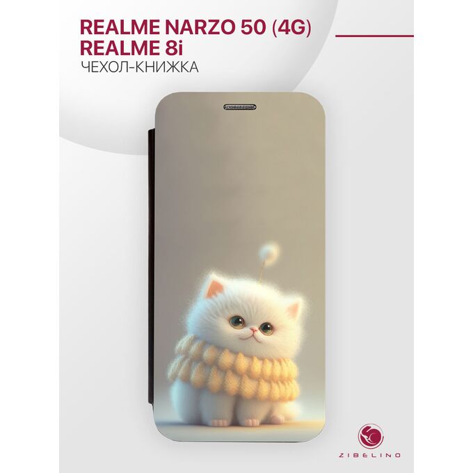 Чехол-книжка Book для Realme 8i (4G), Narzo 50 (4G) черный, с рисунком, с магнитом 1274 БЕЛЫЙ ПУШИСТИК