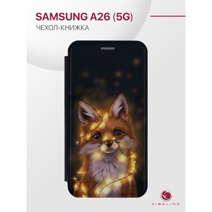 Чехол книжка Book для Samsung A26 (5G) (A266) с рисунком, защитный, противоударный, с магнитом, черный с принтом ЛИСА ОГНИ (Самсунг Галакси А26 А266)