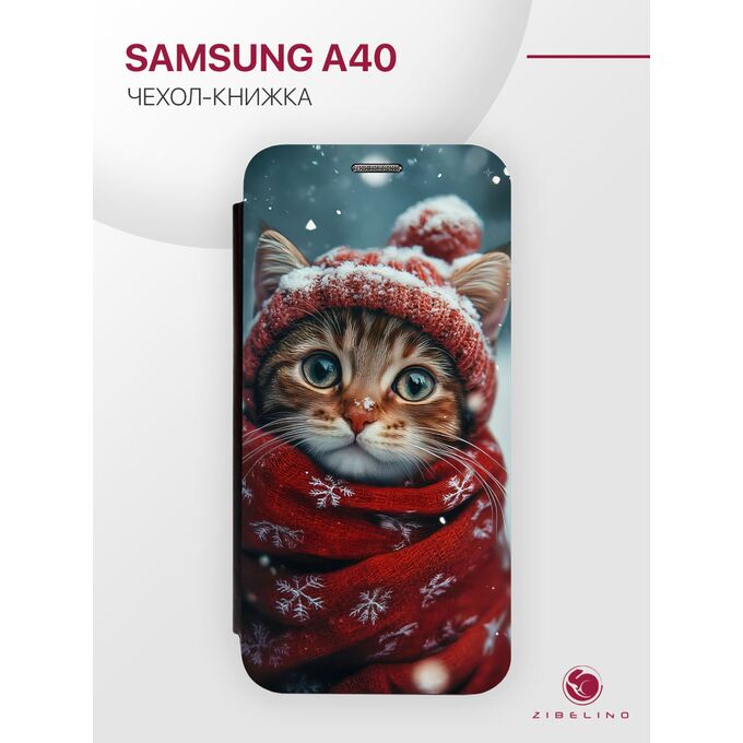 Чехол книжка Book для Samsung Galaxy A40 (A405) с рисунком, с магнитом, черный с принтом КОТИК В ШАПКЕ (Самсунг Галакси А40 А405)