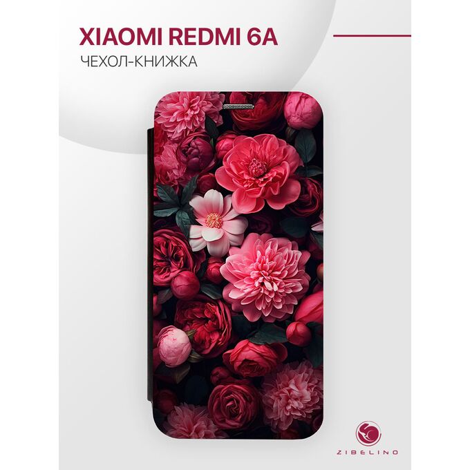 Чехол-книжка Book для Xiaomi Redmi 6A черный, с рисунком, с магнитом 1192 ПИОНЫ КРАСНЫЕ
