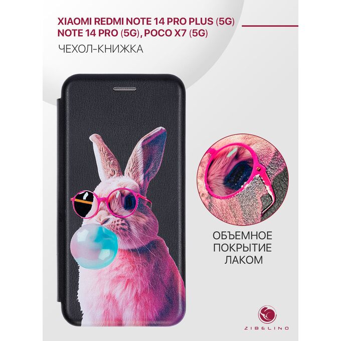 Чехол книжка Book на Xiaomi Redmi Note 14 Pro (5G), 14 Pro Plus (5G), Poco X7 (5G) с рисунком, с магнитом, черный с объемным рисунком ЗАЙКА ОЧКИ, с лаковым покрытием (Редми Нот 14 Про Плюс, Поко Х7)