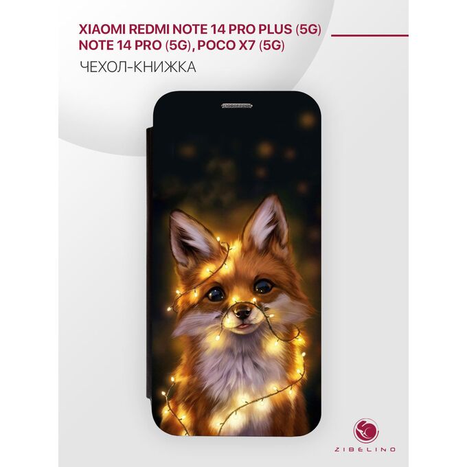 Чехол книжка Book на Xiaomi Redmi Note 14 Pro (5G), 14 Pro Plus (5G), Poco X7 (5G) с рисунком, защитный, с магнитом, черный с принтом ЛИСА ОГНИ (Редми Нот 14 Про Плюс, Поко Х7)
