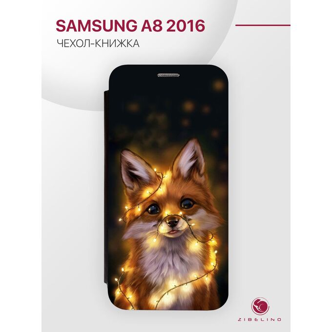 Чехол книжка для Samsung A8 2018 с рисунком, с магнитом, черный, с принтом ЛИСА ОГНИ