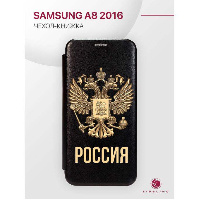 Чехол книжка для Samsung A8 2018 с рисунком, с магнитом, черный, с принтом РОССИЯ ОРЁЛ