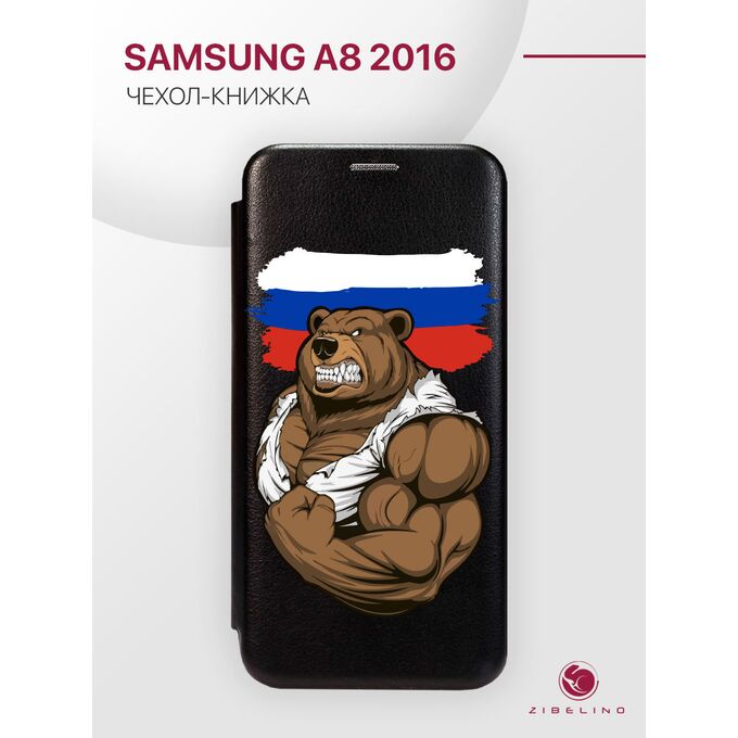 Чехол книжка для Samsung A8 2018 с рисунком, с магнитом, черный, с принтом РОССИЯ СИЛА