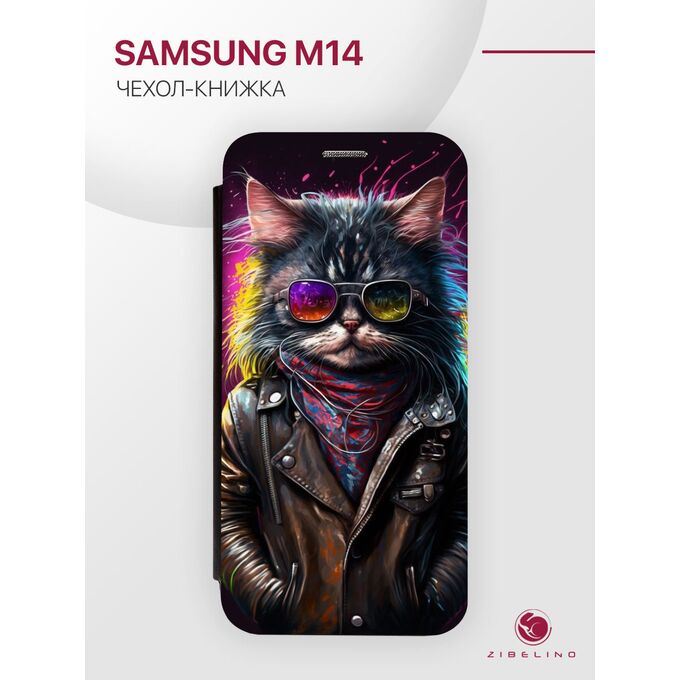 Чехол книжка для Samsung M14 с рисунком, с магнитом, черный, с принтом ПУШИСТЫЙ БАЙКЕР