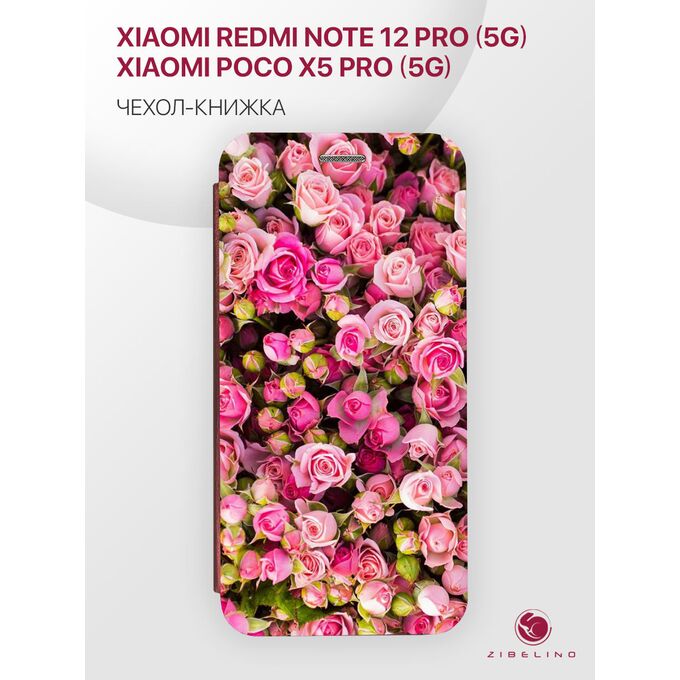 Чехол книжка Book для Xiaomi Poco X5 Pro (5g), Redmi Note 12 Pro (5g) противоударный, с магнитом, бордовый с принтом РОЗОВЫЕ РОЗЫ (Ксиоми Поко X5 Про 5G, Ксиоми Редми Нот 12 Про 5G)