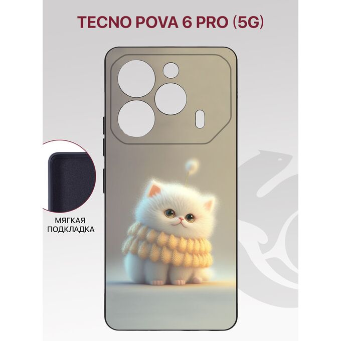 Чехол накладка Soft для Tecno Pova 6 Pro (5G), Pova 6 (4G) с рисунком, с защитой камеры, с мягкой подкладкой из микрофибры, противоударный, черный с принтом БЕЛЫЙ ПУШИСТИК (Техно Пова 6 Про)