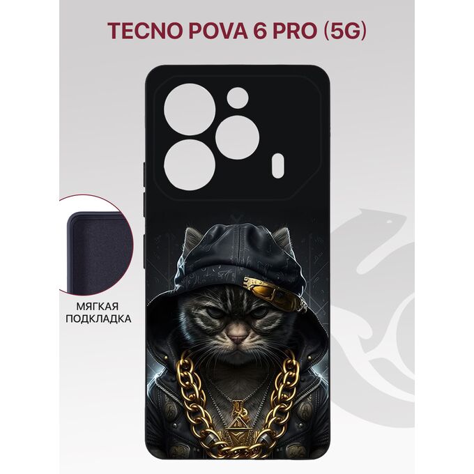 Чехол накладка Soft для Tecno Pova 6 Pro (5G), Pova 6 (4G) с рисунком, с защитой камеры, с мягкой подкладкой из микрофибры, противоударный, черный с принтом КОТ С ЦЕПЬЮ (Техно Пова 6 Про)